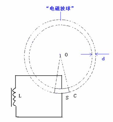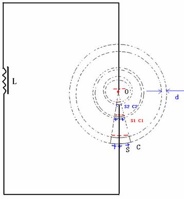 如圖7,在一個由“點電極”O(jiān)與“球冠電極”S組成的“球錐空間”中,如果O與S之間產(chǎn)生了足夠的“特高電壓”,那么這個“球錐空間”就可以被“雙向激擊”,依次連續(xù)發(fā)生“球冠振蕩”……、S2、……、S1、……、S,產(chǎn)生不同頻率的“電磁波球”,并且呈“嵌套球狀”分布,由外到里即由球冠S到點O,產(chǎn)生的“電磁波”的頻率越來越大。
